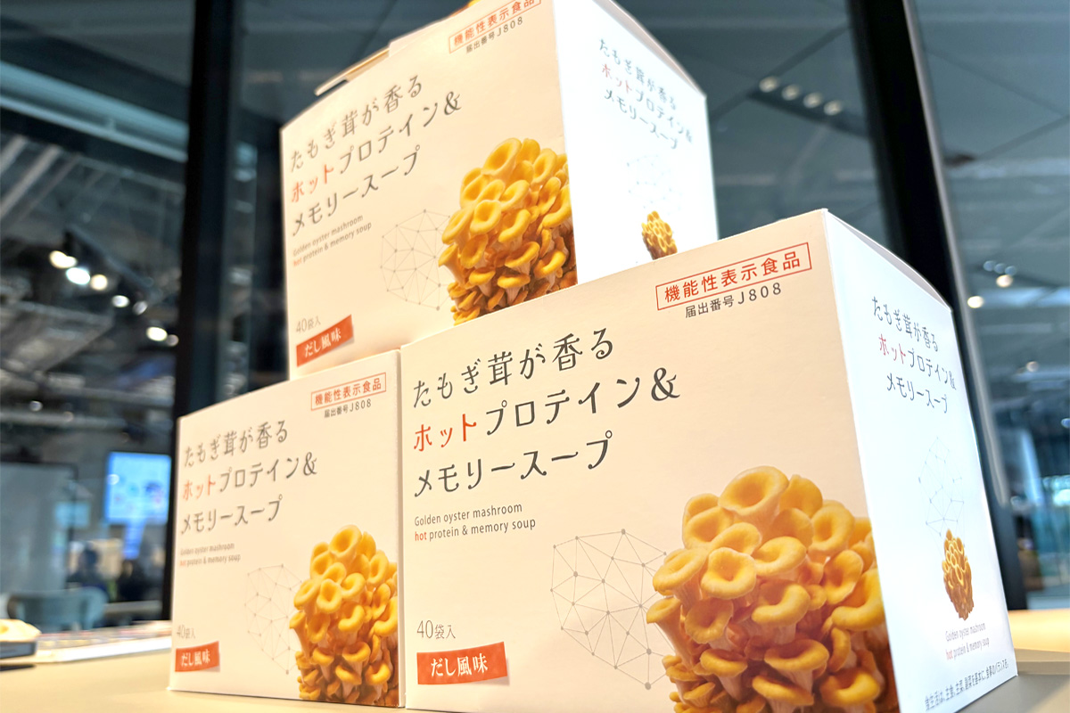 マインドサーキットを体験していただいた方には自社商品の「たもぎ茸が香るホットプロテイン&メモリースープ」のサンプル1袋をプレゼントしました。