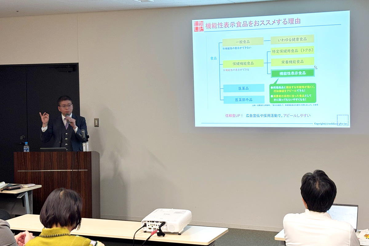 セミナーの前半は「支援側とメーカー側を担ってわかった機能性表示食品の実際」をテーマに講演をし、弊社の商品の例を交えながらお話させていただきました。