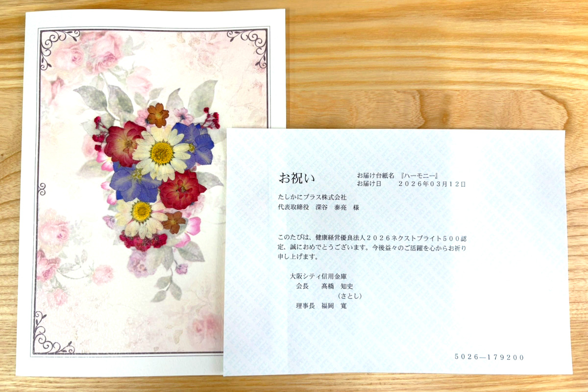 本日、大阪シティ信用金庫様から「健康経営優良法人2026(中小規模法人部門(ブライト500))」の祝電をいただきました!